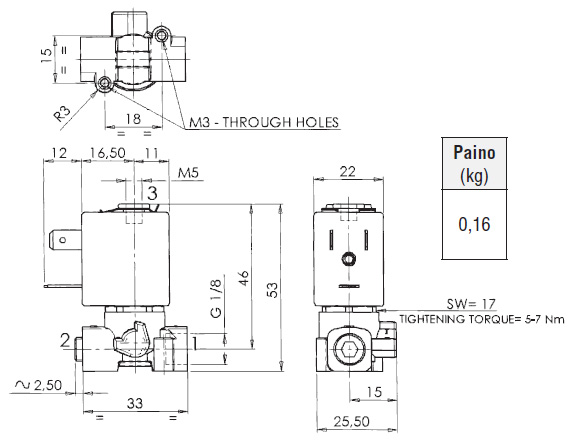 2-tee, 1/8", Normaalselt avatud, rõhkude vahele 0-10 bar