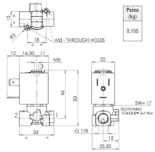 3-tee, 1/8", Normaalselt suletud/avatud ja universaalsed, rõhkude vahele 0-15 bar
